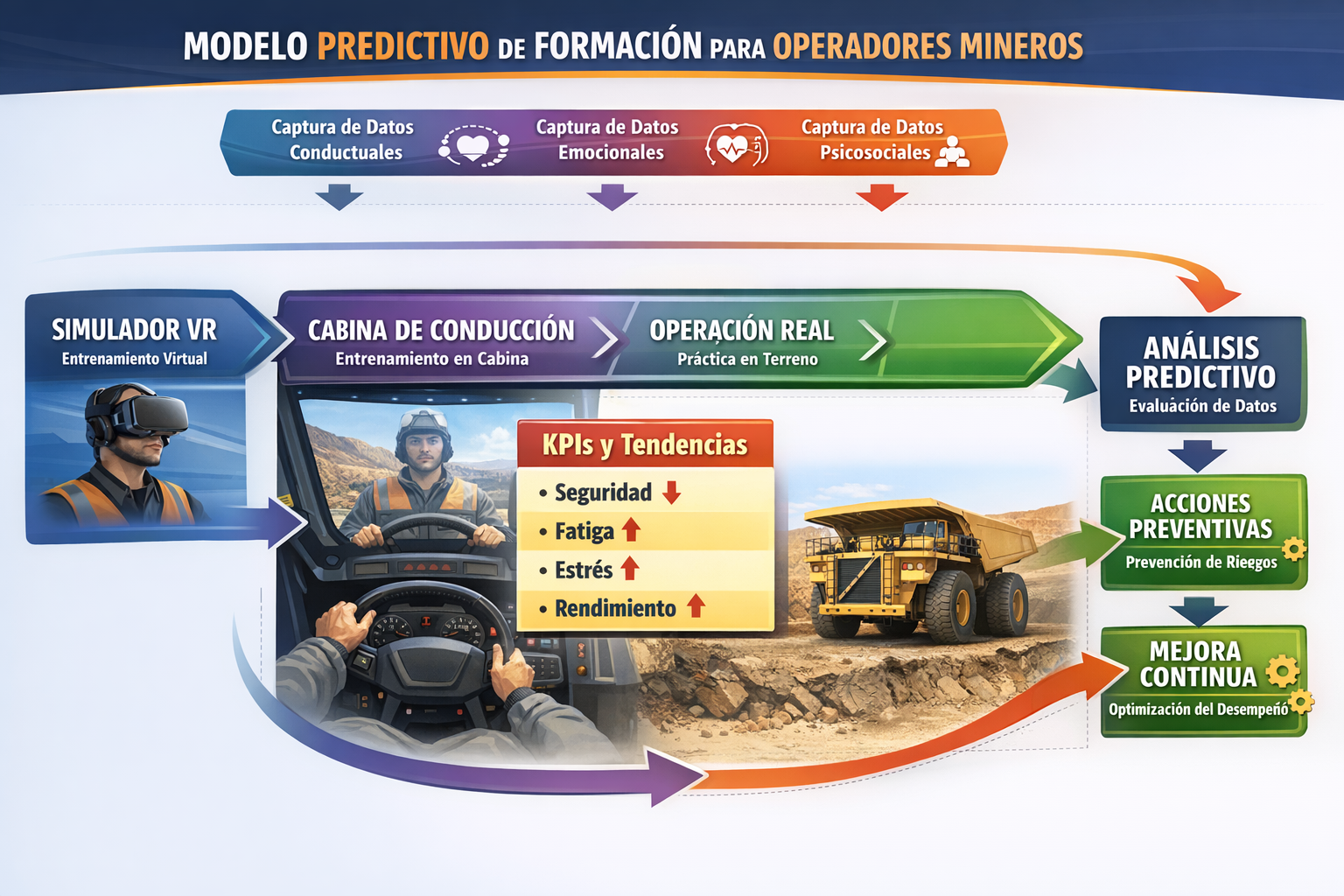 El factor humano influye directamente en la probabilidad de accidentes e incidentes materiales, y también en la aparición y escalamiento de conflictos psicosociales. Nuestros modelos predictivos están diseñados para transformar señales humanas de percepción y señales de conductas operacionales en alertas tempranas y en acciones preventivas concretas. No evalúa personas: mide patrones agregados por segmento para analizar el sistema.