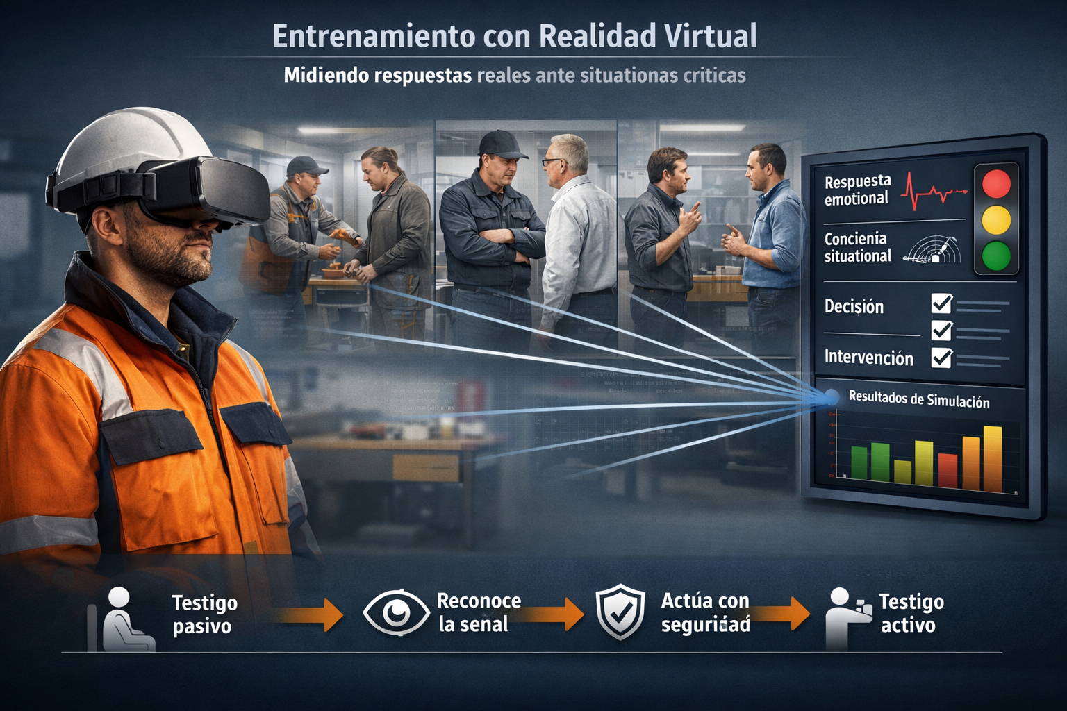 Así, el entrenamiento deja de medir solo conocimiento teórico y empieza a medir respuesta real frente a presión, ambigüedad y silencio grupal. Esto permite identificar patrones agregados, fortalecer conciencia situacional y entrenar habilidades concretas para que la persona pase de testigo pasivo, que observa y no actúa, a testigo activo, capaz de detectar, interpretar y responder de forma segura y oportuna.