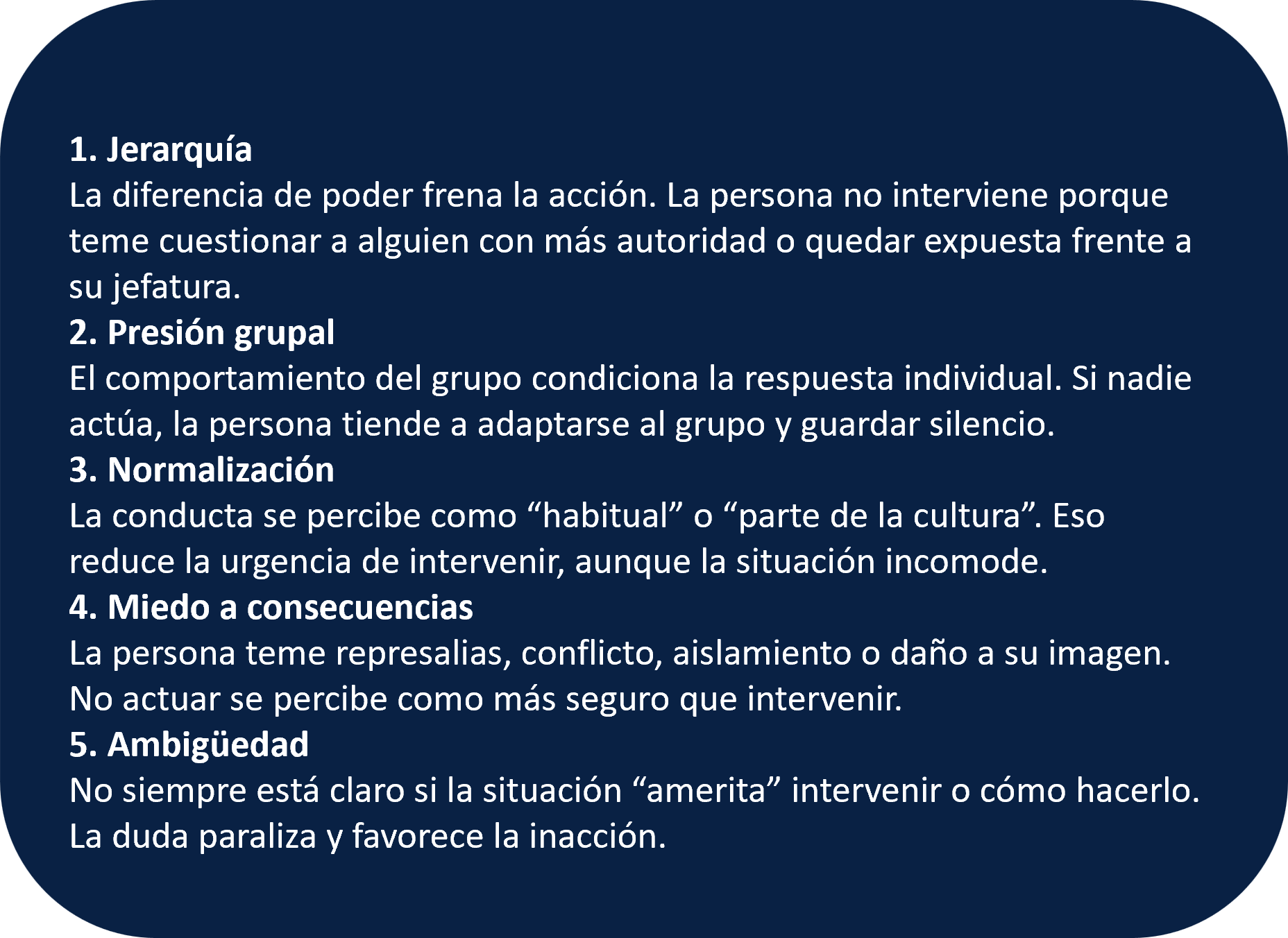 Además, en trabajadores mineros se ha observado que estilos de liderazgo centrados solo en la meta o el resultado final aumentan el agotamiento emocional, reducen la conciencia de seguridad y terminan inhibiendo la conducta segura. Traducido al tema del testigo pasivo: si el mensaje implícito es "no hagas olas, cumple y produce", el observador tenderá a callar justo cuando debería alertar, intervenir o escalar.